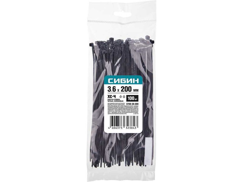 Купить Хомуты-стяжки черные ХС-Ч, 3.6 х 200 мм, 100 шт, нейлоновые, СИБИН