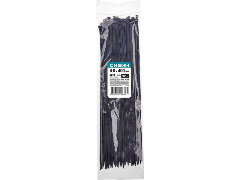 Хомуты-стяжки черные ХС-Ч, 4.8 х 400 мм, 100 шт, нейлоновые, СИБИН