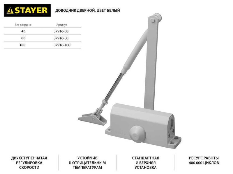 Доводчик дверной STAYER, для дверей массой до 40 кг, цвет белый