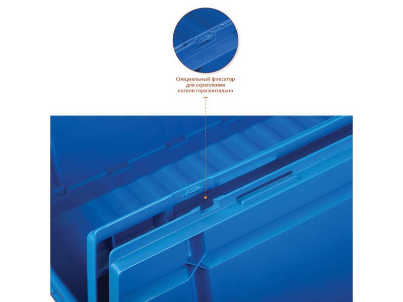 Лотки одного размера можно ставить друг на друга. Также имеется фиксатор, позволяющий скреплять лотки боковыми сторонами