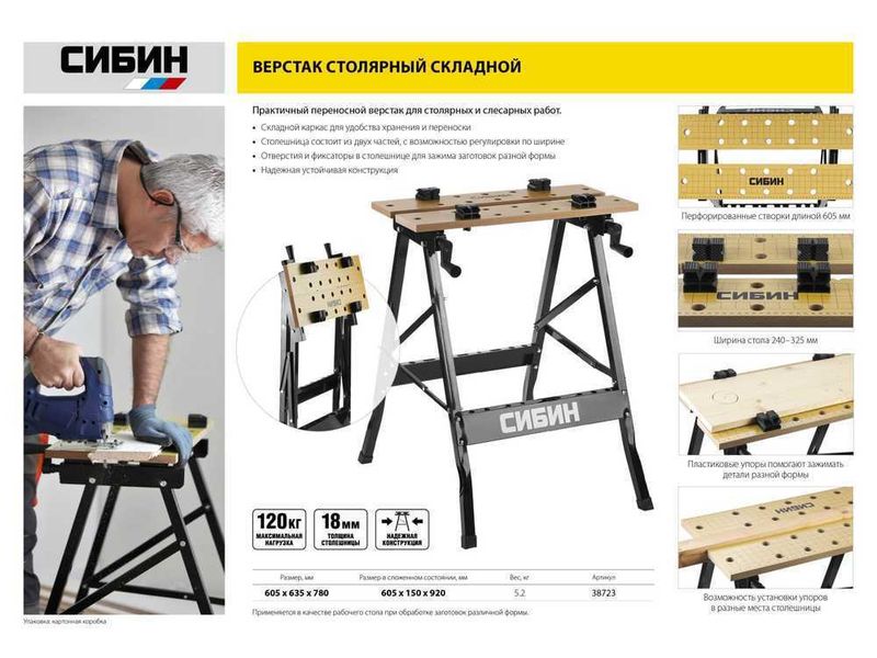 Верстак столярный СИБИН складной, 605х635х780 мм-252