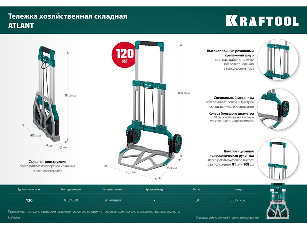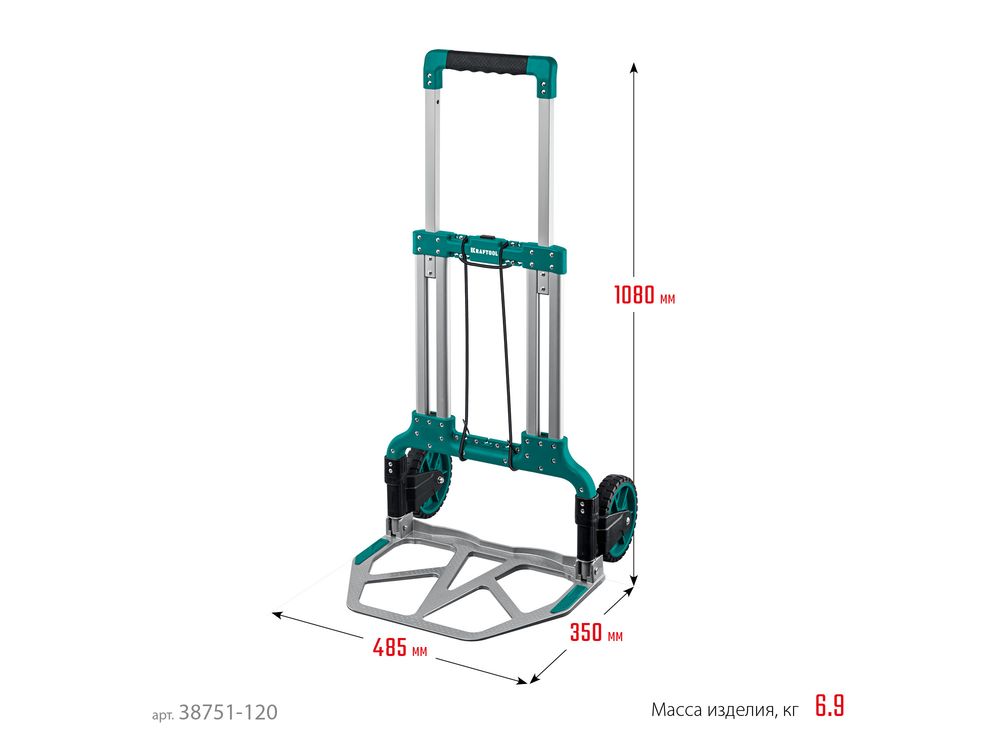 Купить KRAFTOOL ATLANT до 120кг, каркас и платформа из алюминия, платформа 48,5 х 35см, колёса d18см, вес 6,9кг, складная хозяйственная тележка (38751-120)