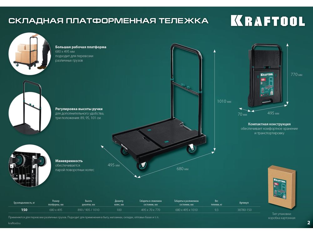 Купить KRAFTOOL до 150 кг, платформа 68,0 х 49,5см, складная рукоятка, складные колёса d10см, вес - 9,3кг, платформенная тележка (38780-150)