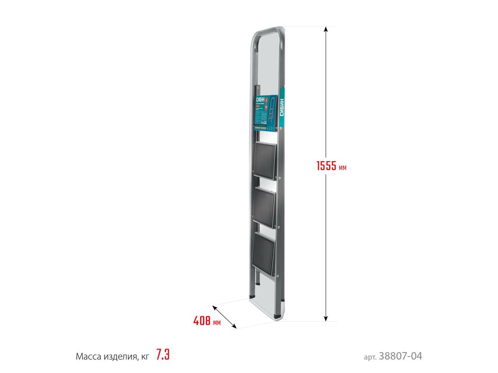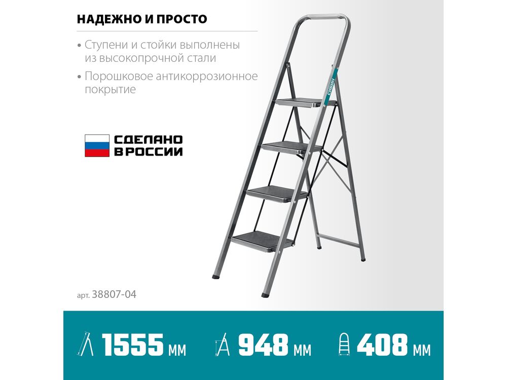 СИБИН 4 ступени, 95 см, c широкими обрезиненными ступенями, стальная, стремянка (38807-04)