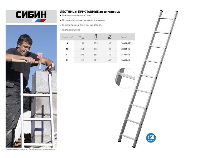 Лестница СИБИН приставная, 9 ступеней, высота 251 см