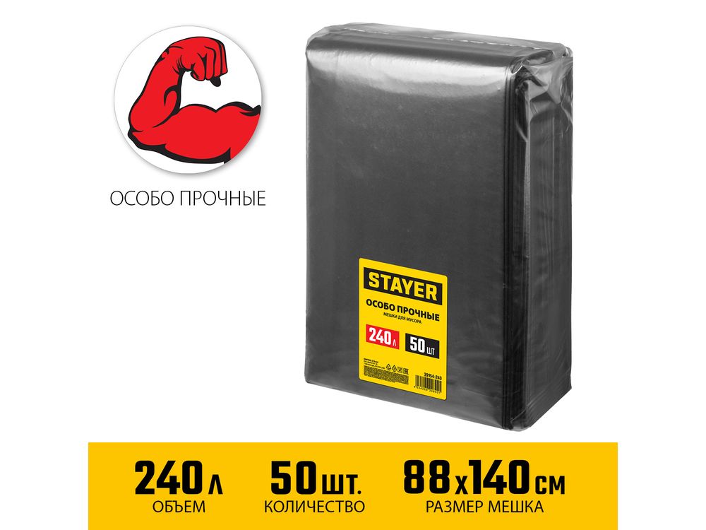 Строительные мусорные мешки STAYER 240л, 50шт, особопрочные, чёрные, HEAVY DUTY