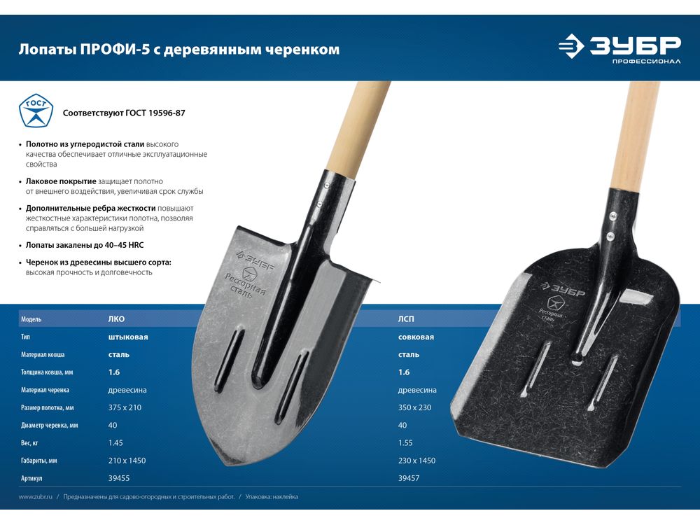 Купить Штыковая лопата c ребрами жесткости ЗУБР ПРОФИ-5, ЛКО, деревянный черенок, 1450 мм