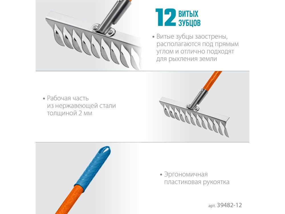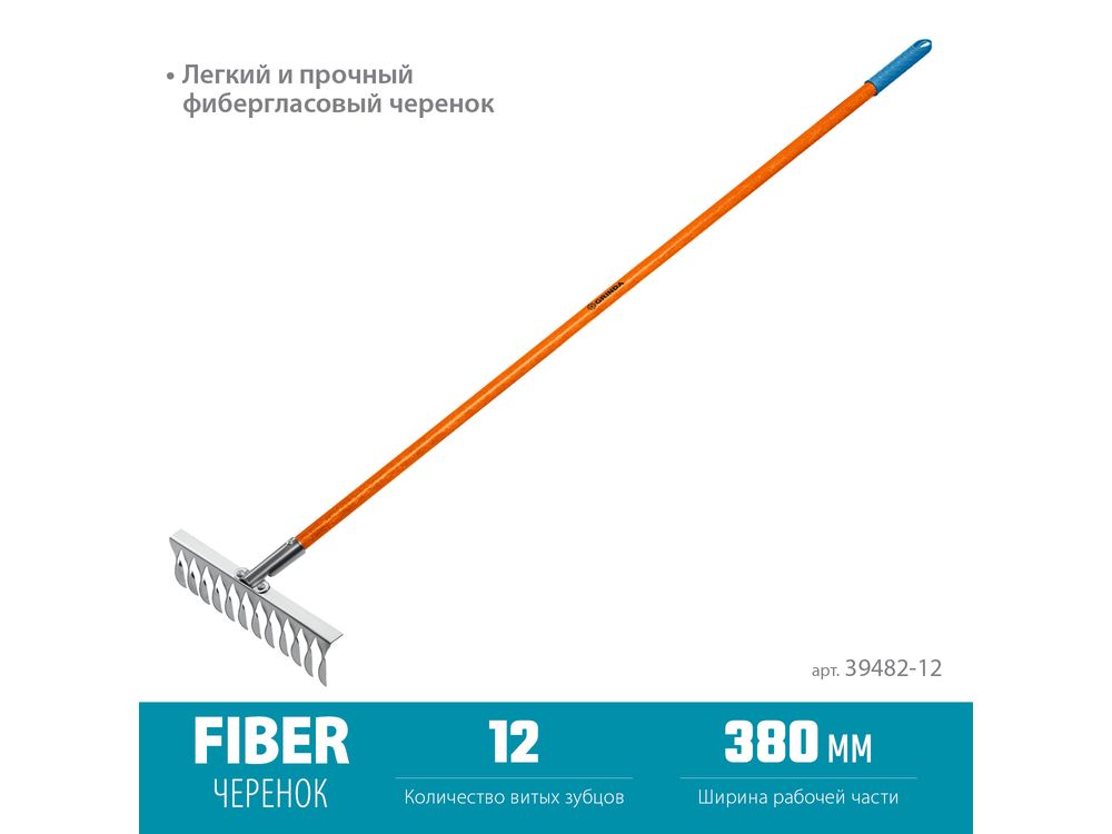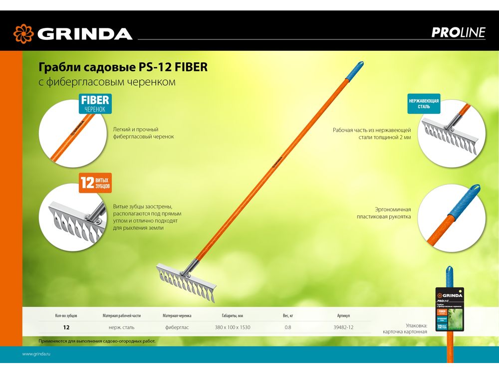 Купить GRINDA PS-12 FIBER, 12 витых зубцов размеры 380 х 100 х 1530 мм, нержавеющая сталь, фиберглассовый черенок, садовые грабли, PROLine (39482-12)