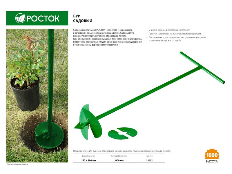Бур садовый РОСТОК, со сменными ножами, 150 мм, 200мм, длина 1000мм