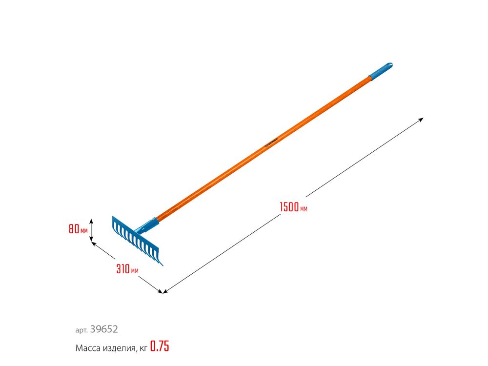 GRINDA PR-12S FIBER, 12 прямых зубцов, размеры 310 х 80 х 1500 мм, углеродистая сталь, фиберглассовый черенок, садовые грабли, PROLine (39652)