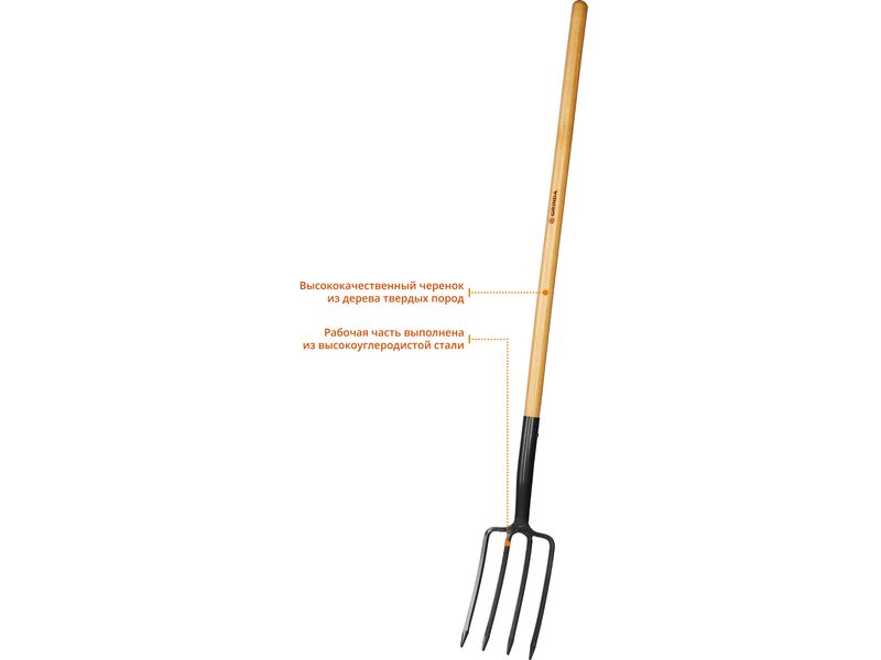Вилы GRINDA применяются на садово-огородных участках, в сельском хозяйстве, в строительстве. Этот долговечный и функциональный инструмент изготовлен из материалов высшего качества и имеет продолжительный срок службы. Рабочая часть состоит из 4 заострённых зубцов из углеродистой стали с защитным покрытием. Прочный черенок из твёрдой древесины покрыт лаком. В комплект поставки входит чехол из ПВХ, обеспечивающий защиту рабочей части при хранении и транспортировке.