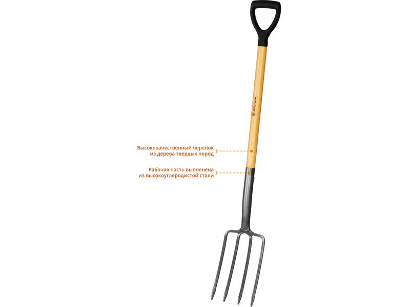 Вилы GRINDA применяются на садово-огородных участках, в сельском хозяйстве, в строительстве. Этот долговечный и функциональный инструмент изготовлен из материалов высшего качества и имеет продолжительный срок службы. Рабочая часть состоит из 4 заострённых зубцов из углеродистой стали с защитным покрытием. Прочный черенок из твёрдой древесины покрыт лаком. Для более удобного хвата на черенке имеется широкая пластиковая рукоятка. В комплект поставки входит чехол из ПВХ, обеспечивающий защиту рабочей части при хранении и транспортировке.