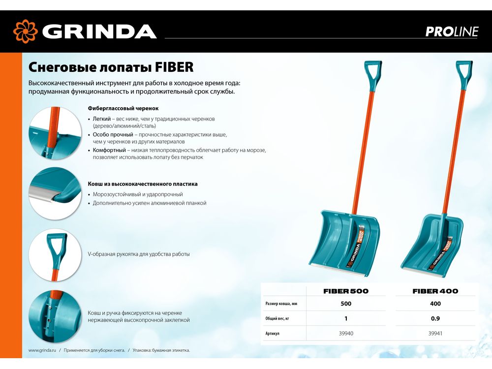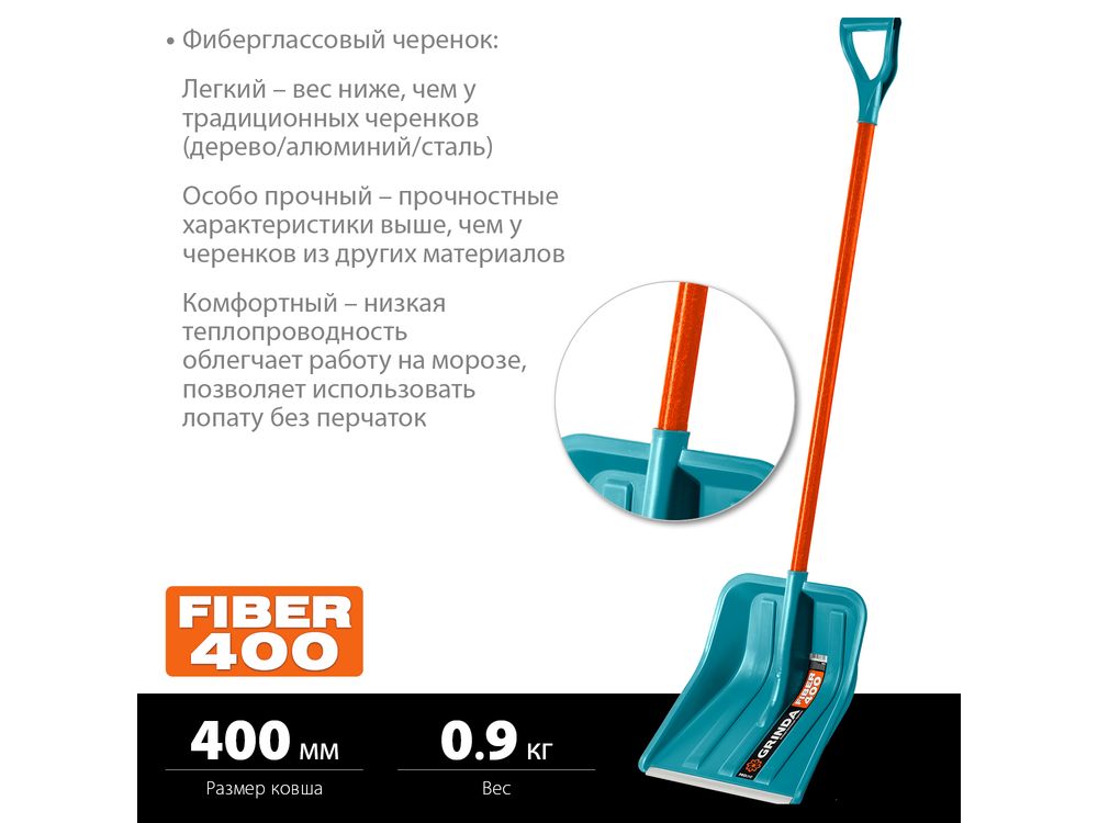 Купить Снеговая лопата GRINDA PROLine FIBER-400 400 мм пластиковая с алюминиевой планкой, особопрочный легкий черенок из фибергласса, V-ручка