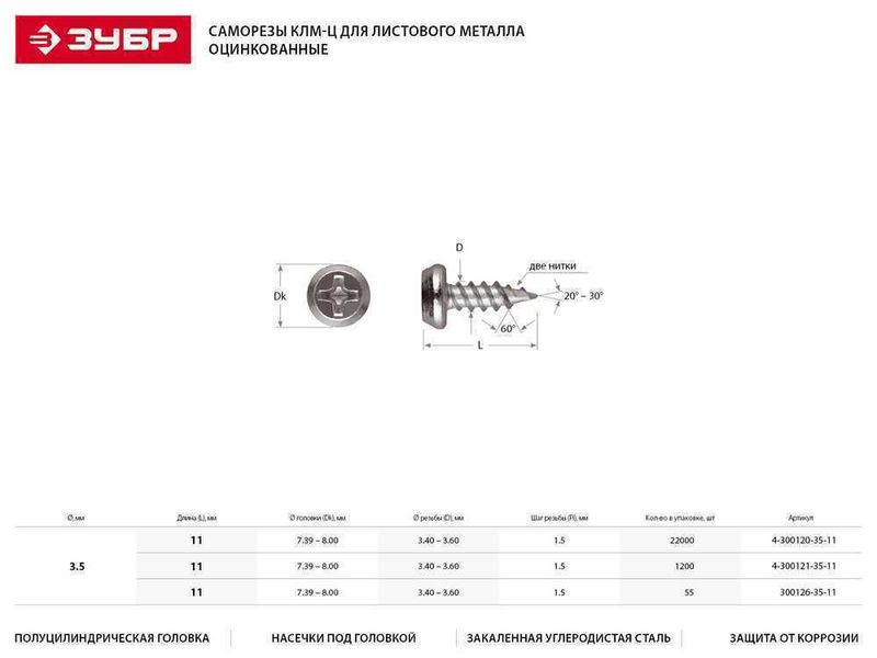 Саморезы ЗУБР оцинкованные по листовому металлу до 0,9мм, п/цилиндр, PH2, 3,5х11мм, ТФ1, 1200шт-755