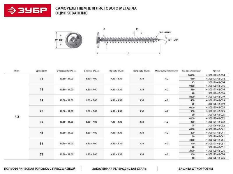Саморезы с пресс-шайбой для листового металла изготовлены из стального прутка с высоким содержанием углерода. Контроль за геометрией самореза начинается с калибровки прутка и заканчивается тщательной проверкой размеров готового изделия. Нормативная твердость стали достигается термической обработкой. Поверхностная твердость 550-720HV, твердость в сердцевине 240-450HV. Саморезы легко вкручиваются обычным шуруповертом или отверткой с крестообразным шлицем PH2 (DIN). Предварительное сверление в скрепляемых материалах не требуется. Геометрические размеры: диаметр пресс-шайбы (W) - 10.5-11.0мм, диаметр головки (Dk) - 6.5-7.0мм, диаметр резьбы (D) - 4.1-4.3мм, шаг резьбы (Pi) - 3.38мм.