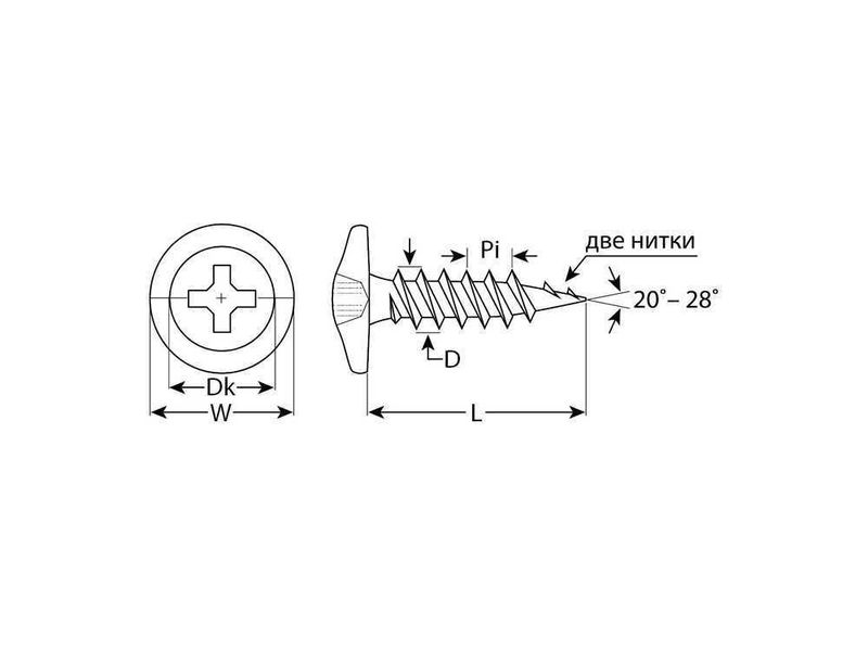 Саморезы с пресс-шайбой для листового металла изготовлены из стального прутка с высоким содержанием углерода. Контроль за геометрией самореза начинается с калибровки прутка и заканчивается тщательной проверкой размеров готового изделия. Нормативная твердость стали достигается термической обработкой. Поверхностная твердость 550-720HV, твердость в сердцевине 240-450HV. Саморезы легко вкручиваются обычным шуруповертом или отверткой с крестообразным шлицем PH2 (DIN). Предварительное сверление в скрепляемых материалах не требуется. Геометрические размеры: диаметр пресс-шайбы (W) - 10.5-11.0мм, диаметр головки (Dk) - 6.5-7.0мм, диаметр резьбы (D) - 4.1-4.3мм, шаг резьбы (Pi) - 3.38мм.
