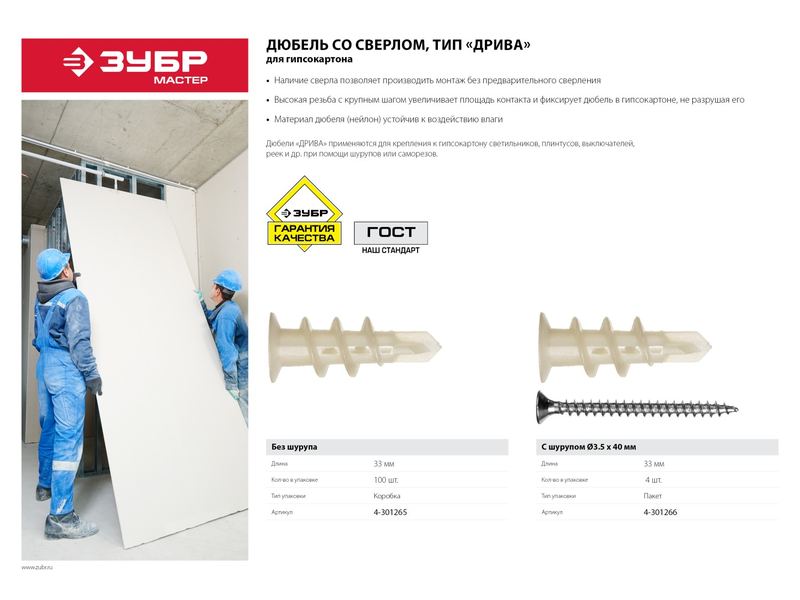 Дюбель ЗУБР "МАСТЕР" нейлоновый, тип "Дрива" со сверлом, для гипсокартона, с оцинкованным саморезом, 33 мм, 4 шт
