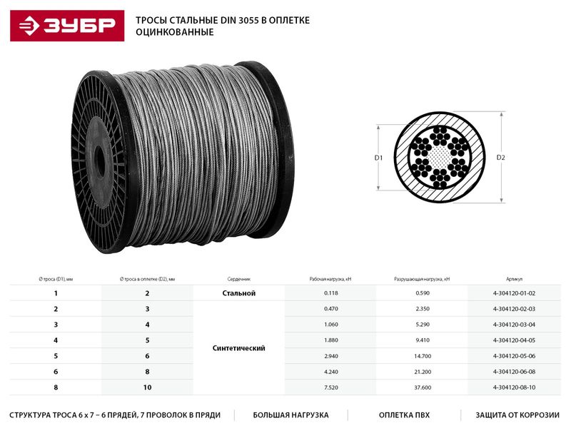 Купить Трос ЗУБР стальной, DIN 3055, оцинкованная сталь в оплетке ПВХ, синтетическая сердцевина, d 1/2мм, L 200м