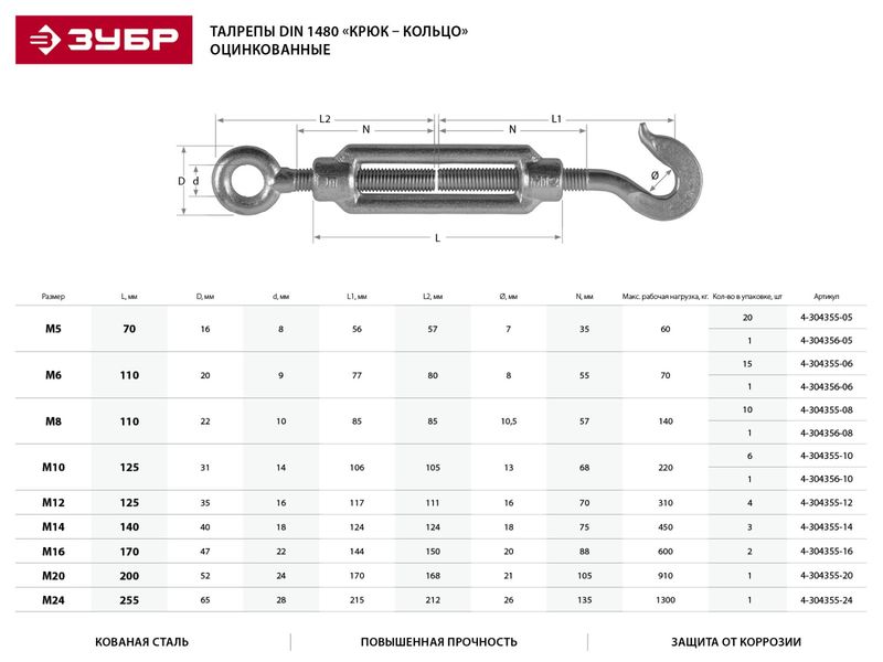 Грузовой крепеж предназначен для фиксации и перемещения грузов с помощью цепей и тросов в различных грузоподъемных механизмах и устройствах. Обладает повышенной прочностью и стойкостью к износу, выдерживает значительные нагрузки без деформации. Талреп используется в большинстве строительных и такелажных работ в качестве натяжителя тросов, цепей и т.д. Талреп состоит из кованой натяжной муфты и резьбовых стержней с крюком и кольцом.