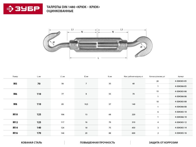 Грузовой крепеж предназначен для фиксации и перемещения грузов с помощью цепей и тросов в различных грузоподъемных механизмах и устройствах. Обладает повышенной прочностью и стойкостью к износу, выдерживает значительные нагрузки без деформации. Талреп используется в большинстве строительных и такелажных работ в качестве натяжителя тросов, цепей и т.д. Талреп состоит из кованой натяжной муфты и резьбовых стержней с двумя крюками.
