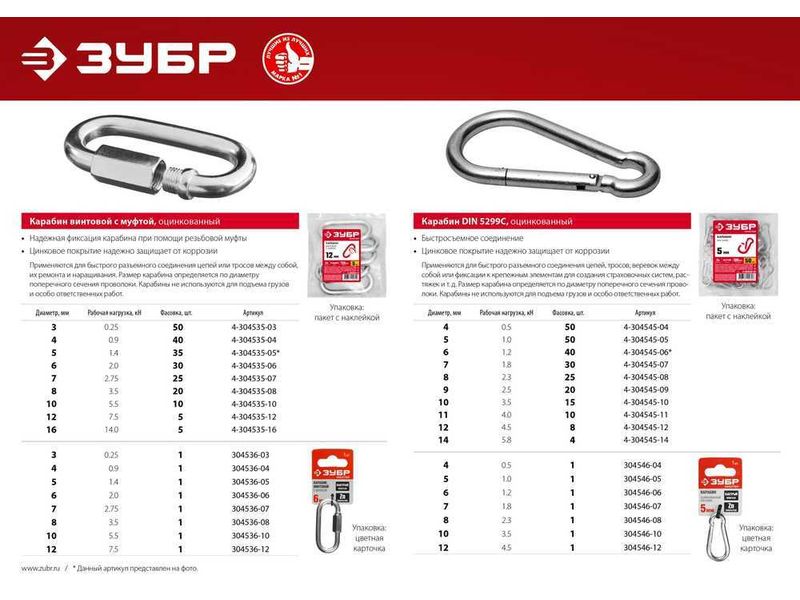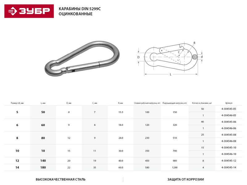 Карабин ЗУБР DIN 5299С, оцинкованный, 8мм, ТФ5, 25 шт