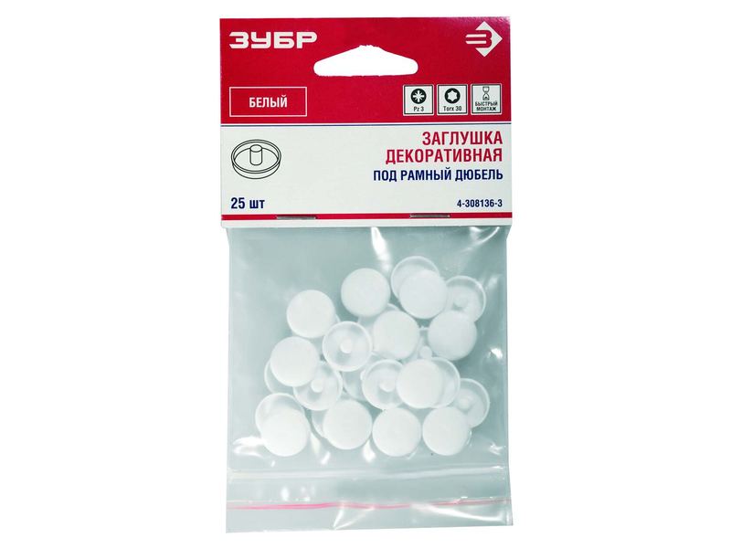 Заглушка декоративная ЗУБР под шуруп, цвет белый, шлиц №2, ТФ6, 40шт