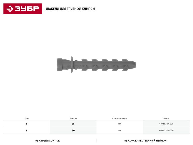 Дюбель ЗУБР для трубной клипсы в п/э ПАКЕТЕ, нейлоновый, 8 х 50 мм, 100 шт