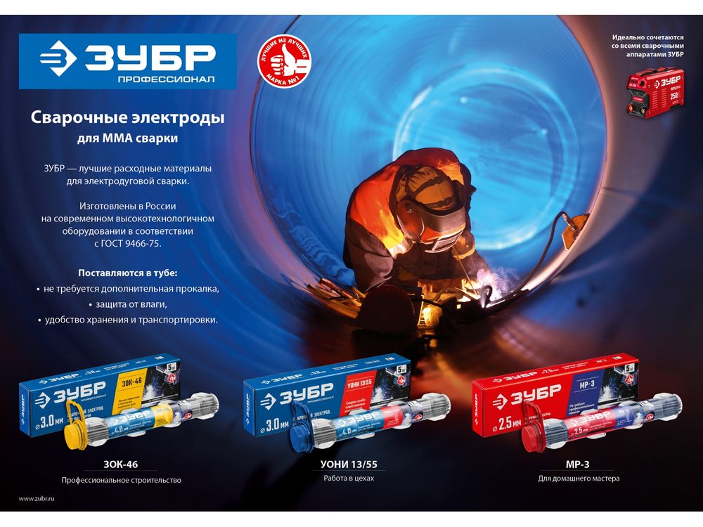 ЗУБР электрод сварочный МР-3 с рутиловым покрытием, для ММА сварки, d 2,5 х 350 мм, 1,5 кг в ПВХ тубе.