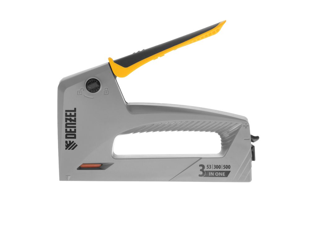 Мебельный степлер Denzel 40213 в пластиковом корпусе работает со скобами типа 53 размером 6-14 мм, а также гвоздями 300 и штифтами 500 длиной 15 мм. Используется для скрепления листовых материалов: фанеры, ДВП, ДСП, оргалита, а также для фиксации пленки и теплоизоляционного материала на деревянном основании. Эффективный ударный механизм позволяет на 30% снизить нагрузку на руку. Инструмент пригодится для обивки мебели, укладки напольных покрытий, выполнения ремонтных и багетных работ.