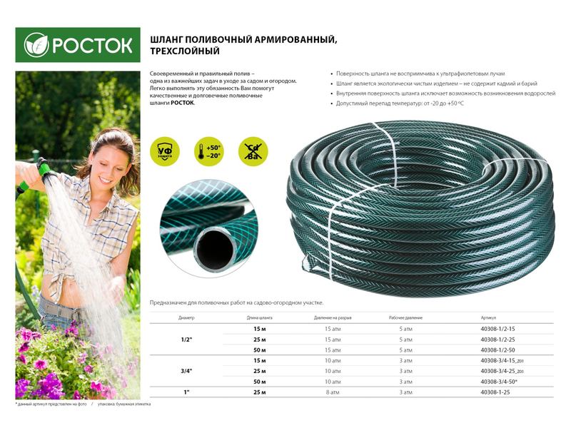 Шланги РОСТОК изготовлены из износоустойчивого и нетоксичного ПВХ. Хорошо заметны на приусадебном участке, благодаря яркому цвету. Гибкие, прочные и долговечные.