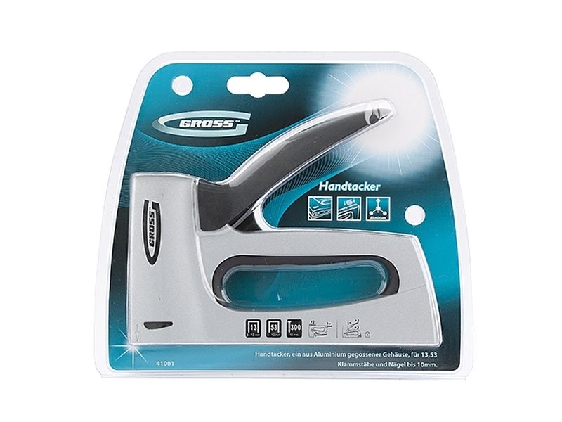 Мебельный степлер Gross 41001 в алюминиевом корпусе работает со скобами типа 13 и 53 размером 6-10 мм и гвоздями типа 300 размером 10 мм. Позволяет крепить к деревянным основаниям листовые материалы из фанеры, оргалита, ДВП, ДСП, а также пленку и утеплитель. Используется для сборки и обшивки мебели, укладки напольных покрытий, выполнения теплоизоляционных и багетных работ. Сбалансированная конструкция позволяет минимизировать отдачу и снизить нагрузку на кисть. Степлер обладает значительным запасом прочности и рекомендован для профессиональных работ.