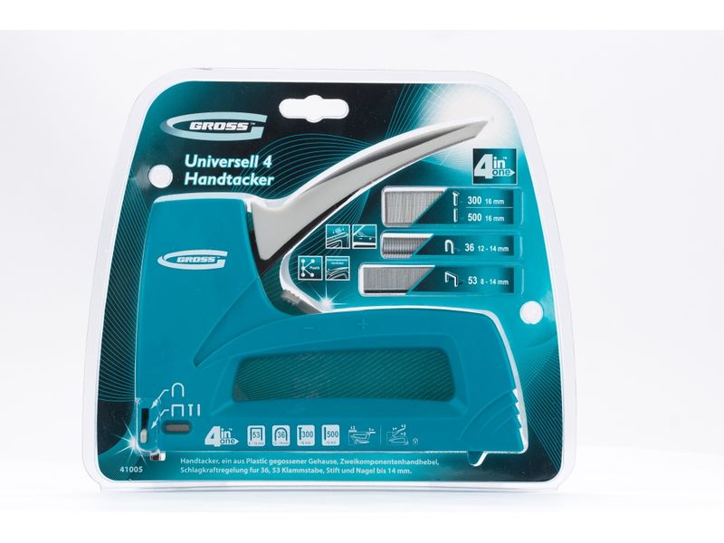 4-функциональный пластиковый мебельный степлер Gross Universell 4 41005 — универсальный инструмент, совместимый со скобами типа 53 размером 8-14 м, 36 размером 12-14 мм, гвоздями типа 300 и штифтами типа 500 размером 16 мм. Предназначен для скрепления с деревянным основанием фанеры, картона, ДСП, ДВП, оргалита, пленки, утеплителя и других листовых материалов. Его используют для обивки мягкой мебели, сборки шкафов, монтажа низковольтных проводов, выполнения багетных и других крепежных работ. Степлер рекомендован для профессионального применения, но будет полезен и в быту. Поставляется со скобами типа 36 в количестве 100 штук, скобами типа 53 (200 штук) и с гвоздями типа 300 и 500 (100 штук).