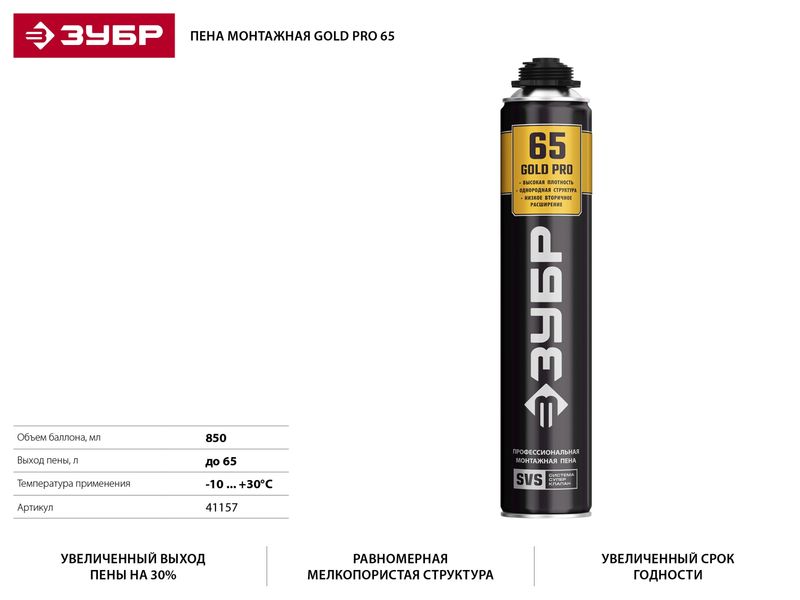 Купить Пена ЗУБР GOLD PRO 65 профессиональная полиуретановая, для монтажного пистолета, всесезонная, SVS, 850мл