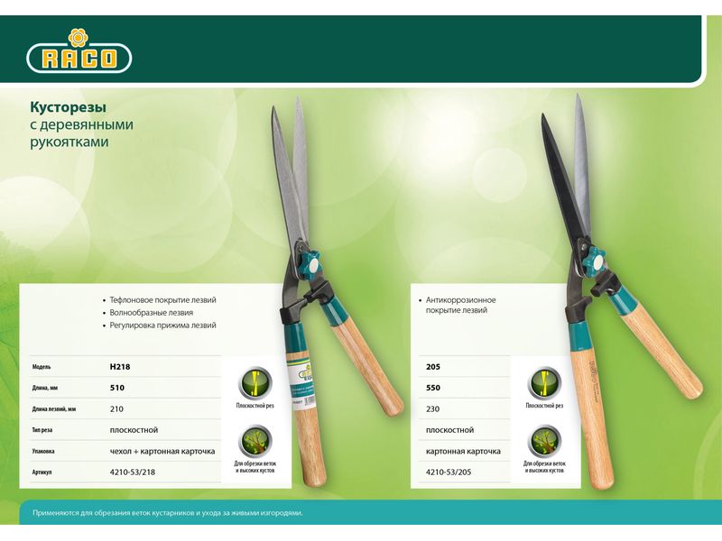 Кусторезы RACO изготовлены из современных и качественных материалов. Обеспечивают чистый рез, удобны в работе, надежны, с длительным сроком службы.