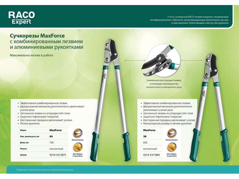 Сучкорезы RACO MaxForce изготовлены из современных и качественных материалов. Новаторское комбинированное лезвие существенно облегчает работу. Благодаря специальному антифрикционному тефлоновому покрытию лезвий и алюминиевым рукояткам инструменты удобны в работе и идеально срезают ветки, обладают длительным сроком службы.