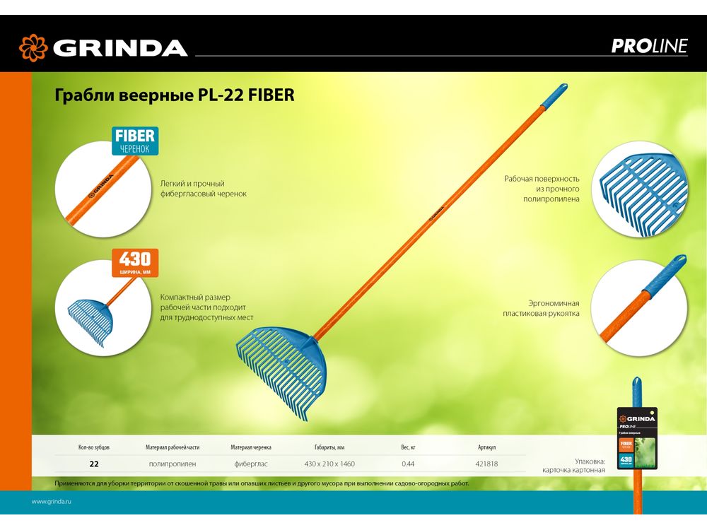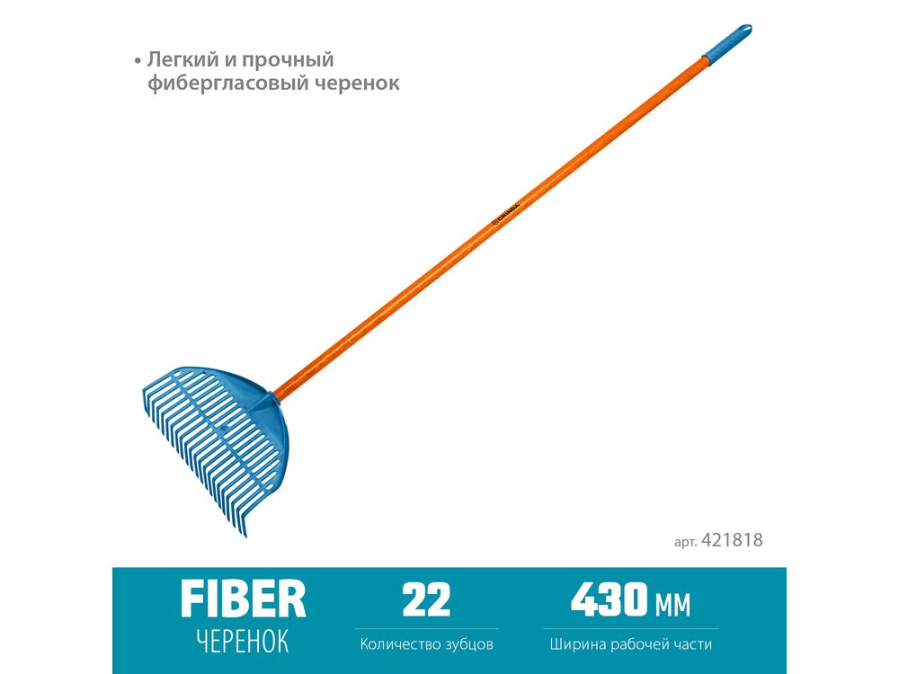 Купить GRINDA PL-22 FIBER, 22 зубца, размеры 450 х 40 х 1460 мм, ударопрочный пластик, фиберглассовый черенок, грабли веерные пластиковые, PROLine (421818) Цена: 701,00 |