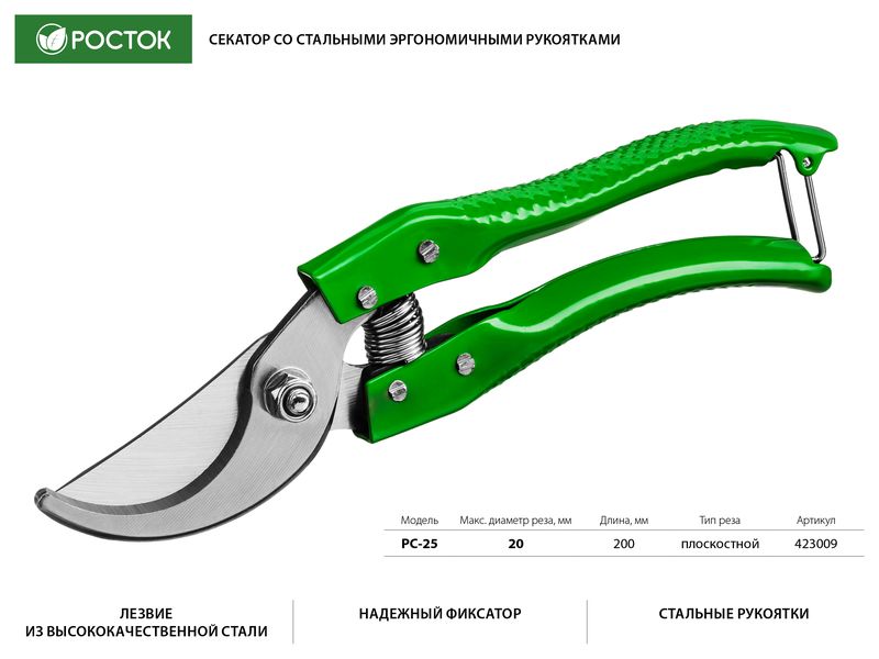 PC-25 Секатор со стальными эргономичными рукоятками, плоскостной, 200 мм, РОСТОК