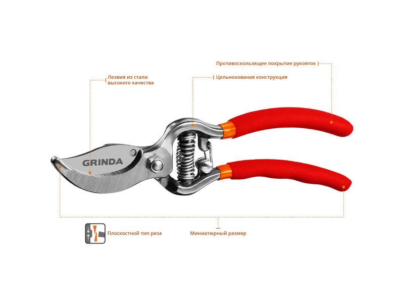 Все секаторы GRINDA являются прочными, долговечными и удобными изделиями, обеспечивая комфортный и лёгкий рез. Они выполнены из высококачественных материалов гарантирующих долгий срок эксплуатации.