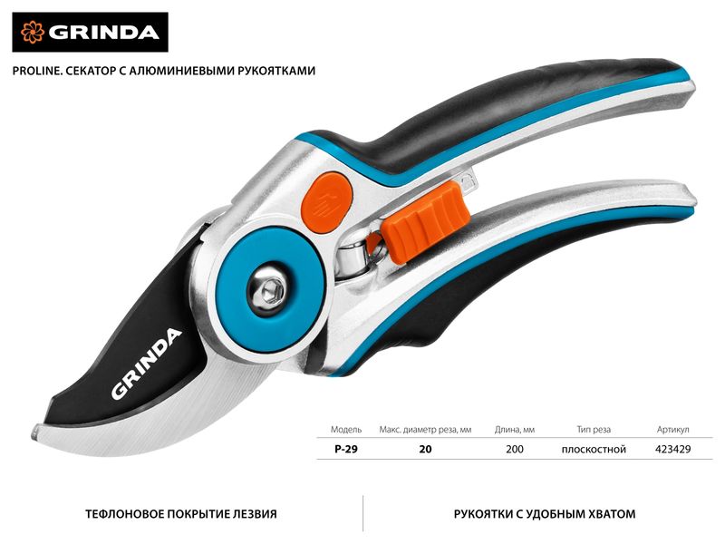 P-29 Секатор с эргономичными алюминиевыми рукоятками, плоскостной, 200 мм, GRINDA PROLine