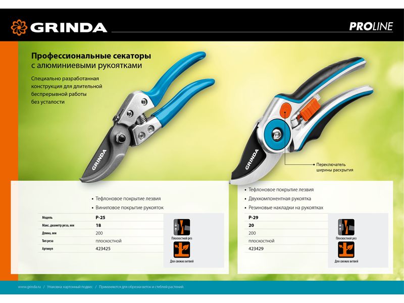 Профессиональные секаторы GRINDA PRO-LINE характеризуются самыми надёжными и современными материалами. Пользуясь этими секаторами вы обеспечите себе удовольствие и комфорт при работах в саду.