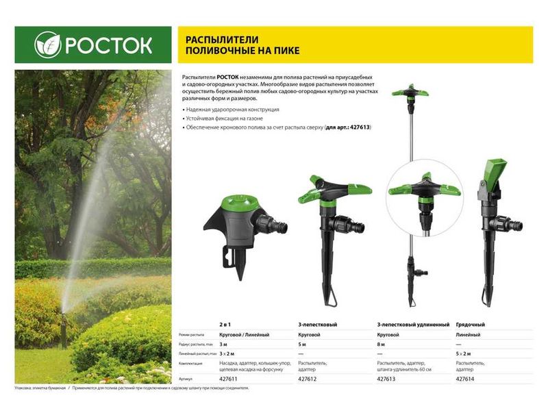 Стационарные распылители РОСТОК надёжны и долговечны. Обеспечивают быстрое подключение к поливочной системе и долговременный полив, изготовлены из качественного пластика.