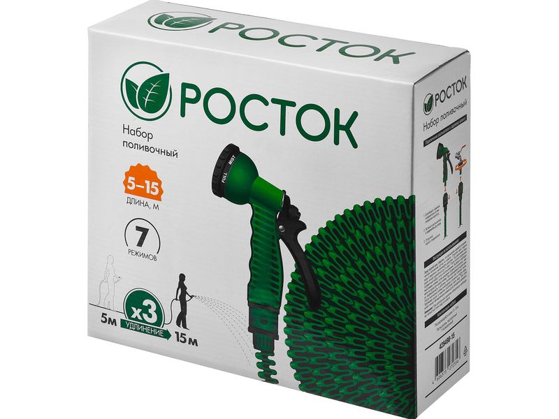 Набор поливочный: Шланг удлиняющийся 15 м, распылитель пистолетный 7 поз., адаптер внеш 1/2 x3/4