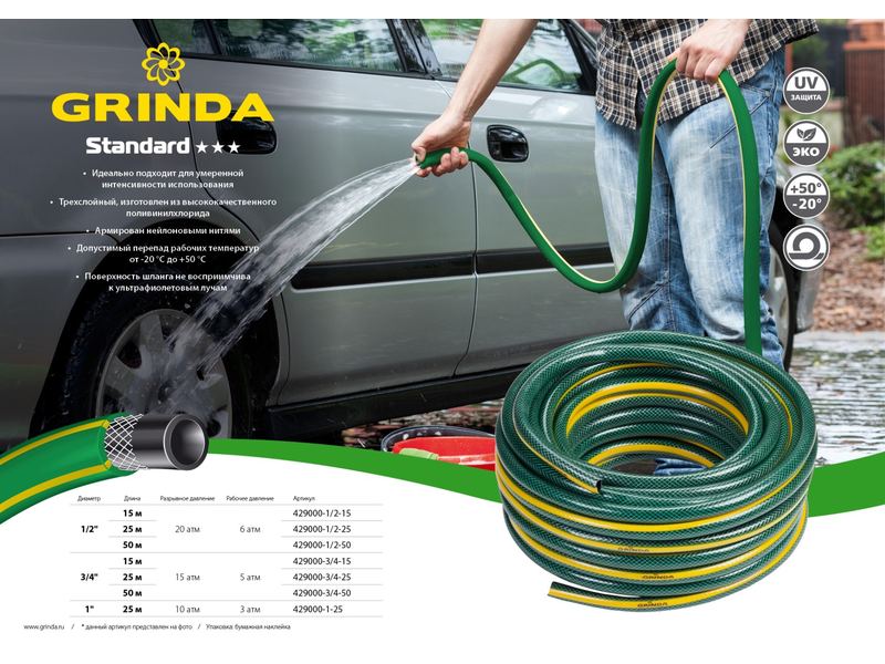Шланг GRINDA "STANDARD" поливочный, 3-х слойный, 15атм, 3/4",50 м