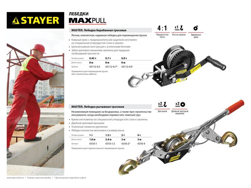 Лебедка ручная барабанная STAYER "MASTER", тяговая, тросовая, 0,9т, 8м-316