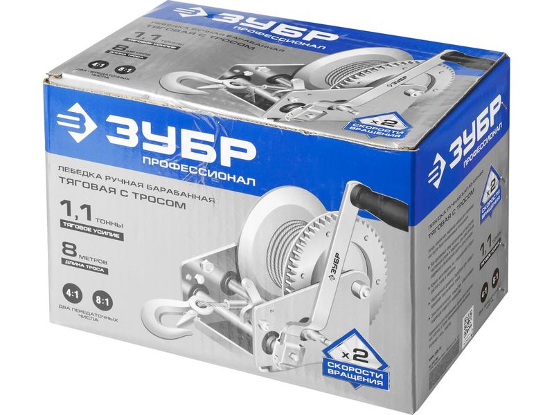 Лебедка ручная барабанная ЗУБР "ПРОФЕССИОНАЛ", тяговая, тросовая, 1,1т, 8м