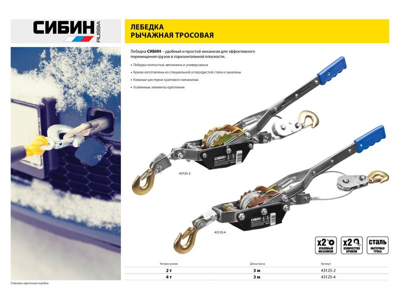 Автомобильные принадлежности arrow Лебедка arrow Лебедка ручная рычажная СИБИН, тросовая, 2т, 3м-316