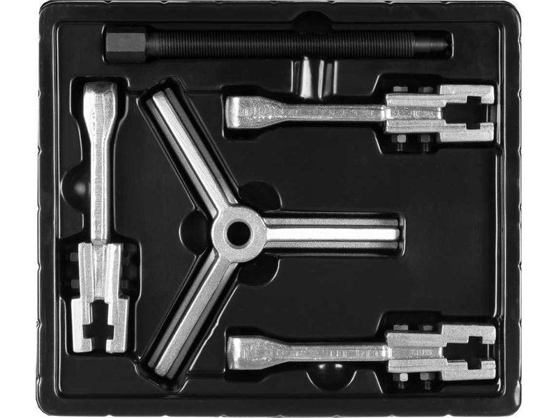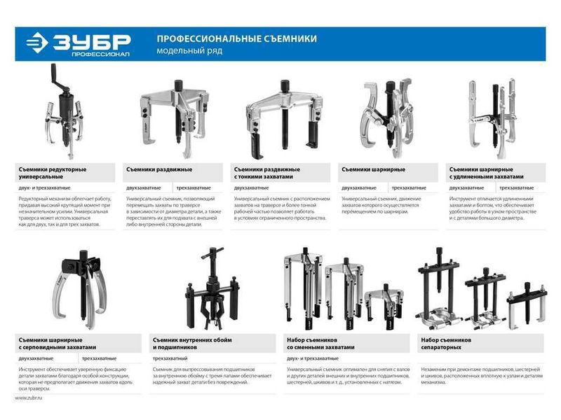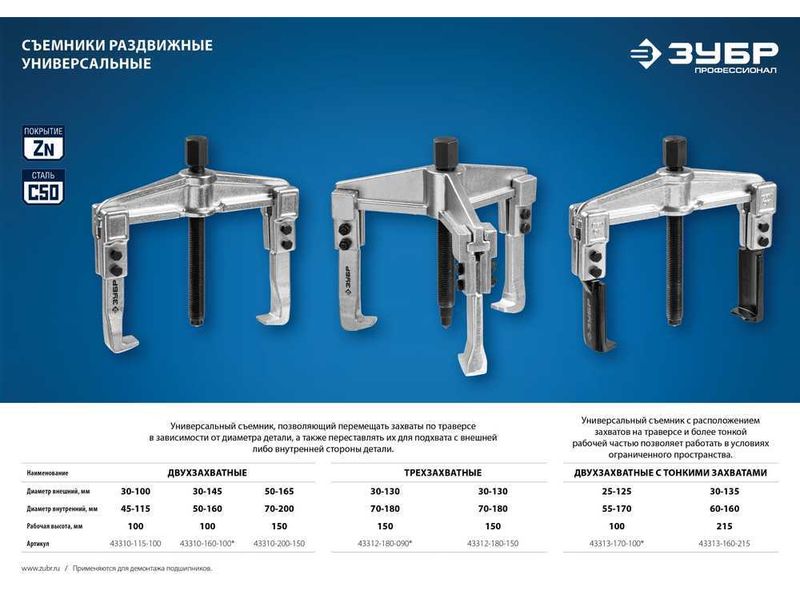 Захваты съемника выкованы из качественной инструментальной стали, что обеспечивает долгий срок службы при работе с высокими нагрузками. Позволяет работать с широким рядом узлов