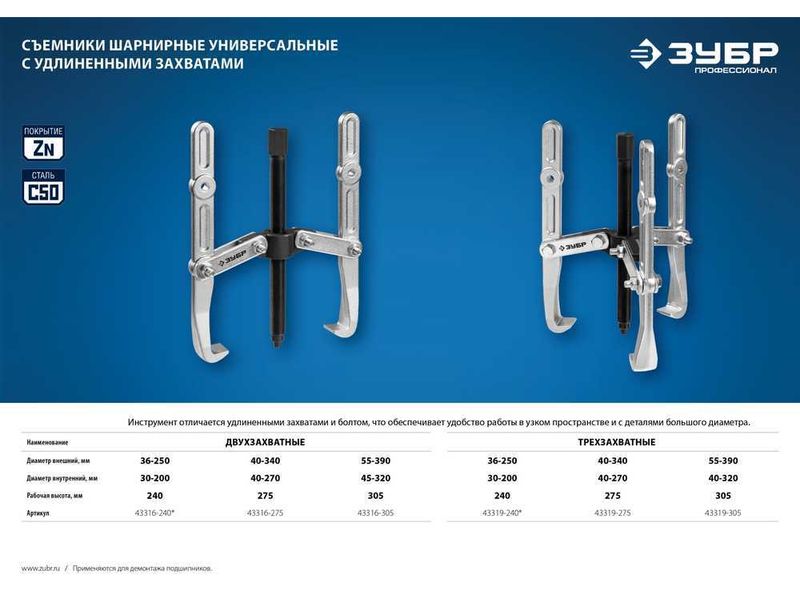 Съемник шарнирный 2-захватный с удлиненными захватами, 240 мм, ЗУБР Профессионал 43316-240