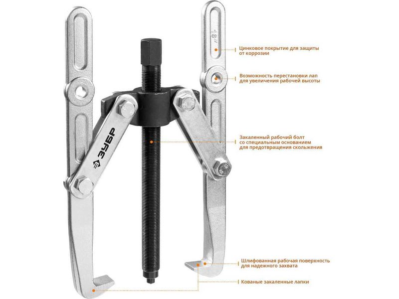 Захваты съемника выкованы из качественной инструментальной стали, что обеспечивает долгий срок службы при работе с высокими нагрузками. Позволяет работать с широким рядом узлов