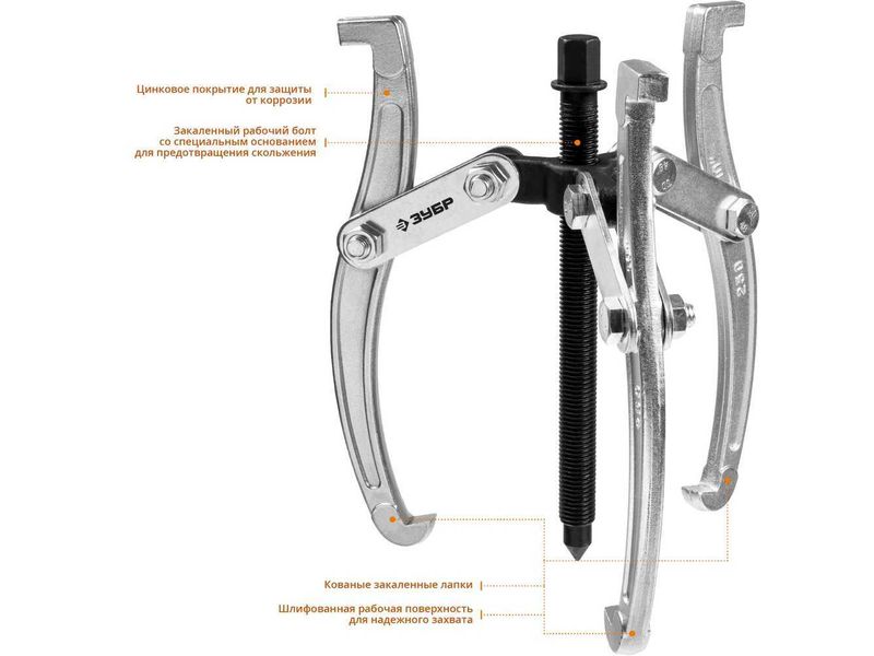 Захваты съемника выкованы из качественной инструментальной стали, что обеспечивает долгий срок службы при работе с высокими нагрузками. Позволяет работать с широким рядом узлов